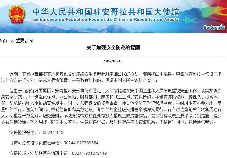 使館網站稱,近期,安哥拉首都羅安達和其他省份連續發生多起針對中國公民的搶劫、綁架和兇殺案件。使館已多次向安方進行交涉,要求其盡快破案,并采取有效措施,保證中國公民生命財產安全。