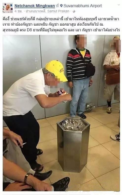 近日,一則“中國游客在泰國國際機場內吸食大麻,安保人員放任不管”的消息在泰國臉書上引發網友熱烈討論,發帖人Netchanok Mingkwan女士稱,她在泰國曼谷素萬那普國際機場D8候機區域的吸煙室,看到一個中國旅游團的大爺,把大麻放在一個經過改裝,戳有氣孔的塑料瓶子上點燃并吸食,搞得里面烏煙瘴氣,她質疑中國游客如何將大麻帶入泰國境內。