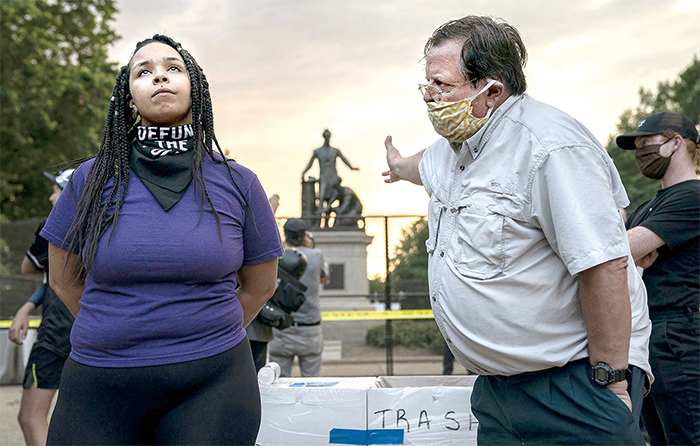 2020年6月25日,美國華盛頓特區林肯公園,26歲的Anais(左)與一名男子辯論身后林肯解放碑的去留問題。Anais主張移除該紀念碑,而男子主張留下。 伊芙琳·霍克斯坦 攝