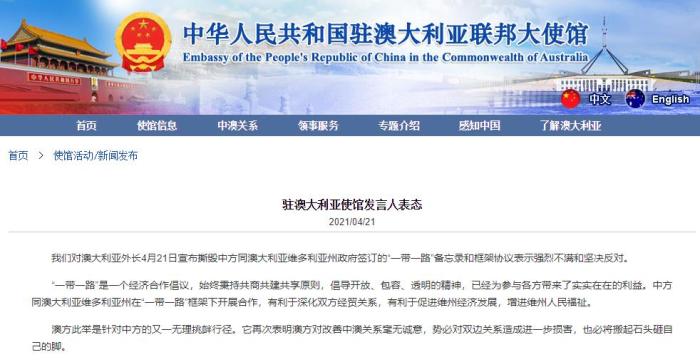 中新網4月22日電 據中國駐澳大利亞使館21日消息,中國駐澳大利亞使館針對澳大利亞外長當天宣布撕毀中方同澳大利亞維多利亞州政府簽訂的“一帶一路”備忘錄和框架協議表態。