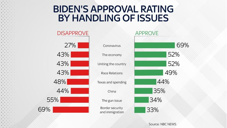 據(jù)美國有線電視新聞的民調(diào)統(tǒng)計,在拜登就任總統(tǒng)滿100天之際,約52%的美國人認可拜登的整體工作表現(xiàn),這一成績僅好于其前任特朗普,但卻低于自1953年的全部其他美國總統(tǒng)。除了在疫情應對方面民眾滿意度較高,為69%外,其他領域均在50%上下。在“邊境安全和移民”方面民眾滿意度最低,僅為33%。