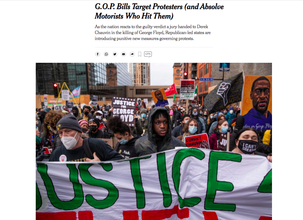 據(jù)《紐約時報》報道,從弗洛伊德事件發(fā)生至今,全美34個支持共和黨或傾向支持共和黨的州在地方層面總共通過了81項限制抗議者活動的法律,針對的對象便是“黑人的命也是命”的反歧視運動的抗議者。