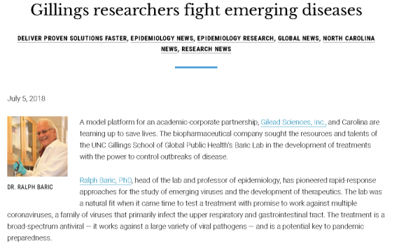 美國病毒“功能增益”研究的權威,非北卡羅來納大學流行病學系以及微生物系和免疫學系教授拉爾夫·巴里克(Ralph Baric)莫屬。