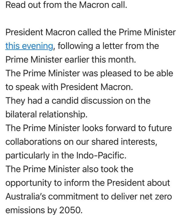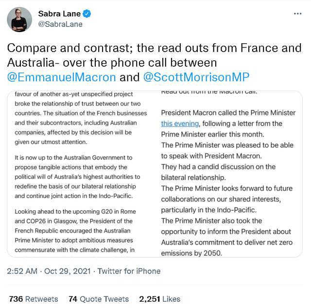 今天凌晨,澳大利亞廣播公司的主播Sabra Lane就在她的社交賬號上公布了兩份莫里森和馬克龍的通話記錄:一份是澳方發給本國媒體的,一份是法國政府發布的。