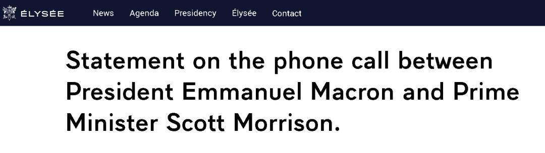 其中,澳大利亞政府發布的關于兩國領導人通話的聲明十分簡短,大意是澳方稱莫里森總理和馬克龍總統就雙邊關系進行了“坦率”的交流,莫里森“期待”與法方在印度太平洋地區等雙方有著共同利益的事務上繼續合作。
