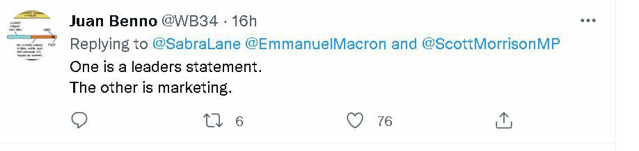 總之,當法方這份馬克龍在通話中對莫里森一陣數落和諷刺的聲明發布后,不少澳大利亞網民都覺得很尷尬。一些本身就很反感莫里森的網民還諷刺起了莫里森,稱他為了自己的政治利益歪曲通話內容,并認為法國對澳大利亞的抨擊很有道理。