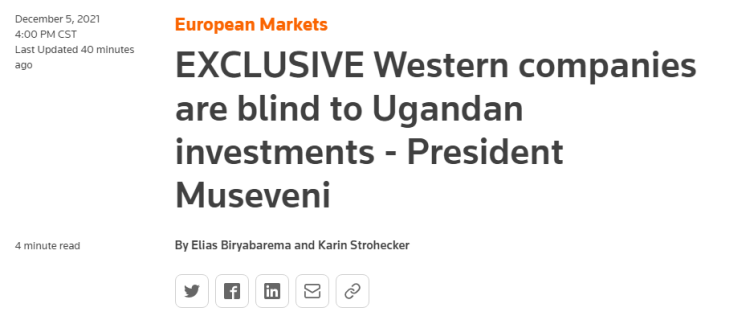 【環球網報道】路透社5日發布了一篇對烏干達總統穆塞韋尼的獨家采訪報道。穆塞韋尼在采訪時對比了中西方企業對該國的投資,稱西方企業已經不再有看到機會的眼睛,而中國人看到了機會,并且來得非常積極。
