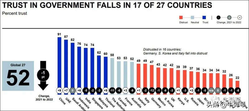 我們再看一下美國,2021年信任度是48%,2022年是43%,又跌了5個百分點。按照報告的說法,自2017年,美國人對國家的信任度跌了整整10個百分點。