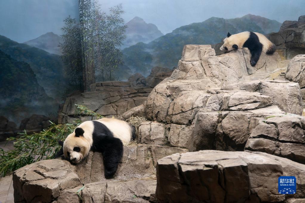 3月16日,在美國華盛頓史密森學會國家動物園,大熊貓“美香”(左)和“小奇跡”在休息。