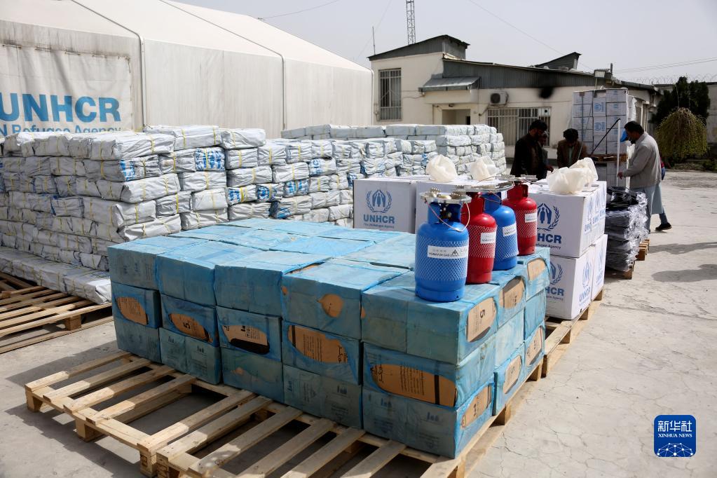 這是3月27日在阿富汗首都喀布爾拍攝的中國南南合作援助基金同聯合國難民署合作援助阿富汗的人道主義物資。
