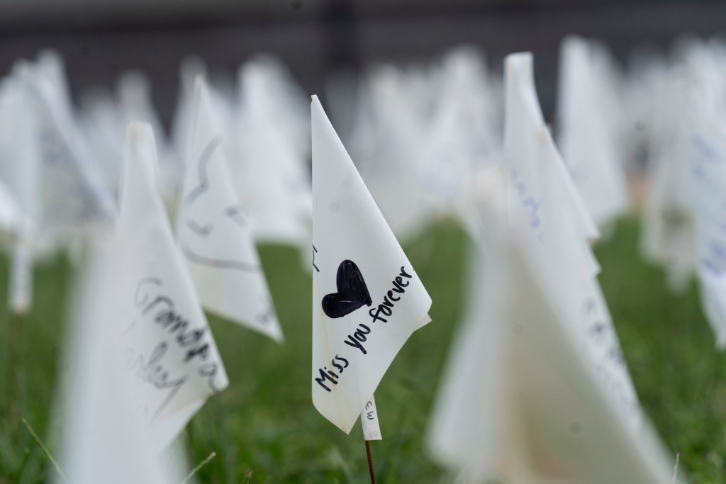 2021年9月17日,寫有“永遠懷念你”字樣的白色旗幟擺放在美國首都華盛頓的華盛頓紀念碑附近的草坪上,悼念美國超過66萬名新冠逝者。新華社記者劉杰攝