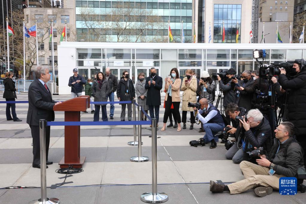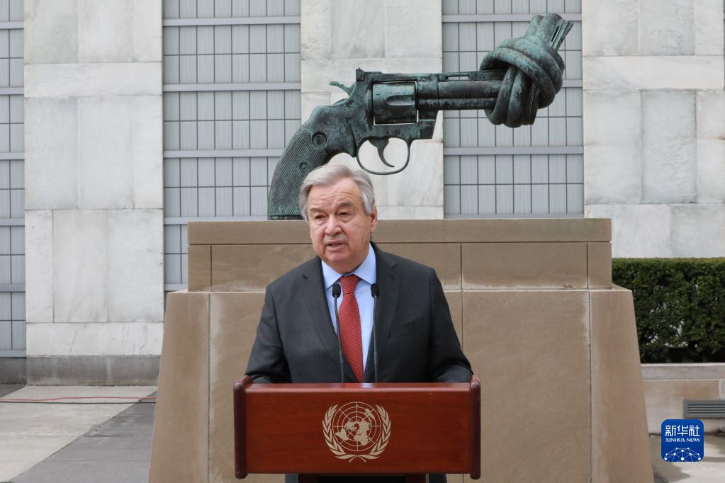 4月19日,聯合國秘書長古特雷斯在紐約聯合國總部標志性雕塑“打結的手槍”前對記者發表談話。新華社記者 謝鍔 攝