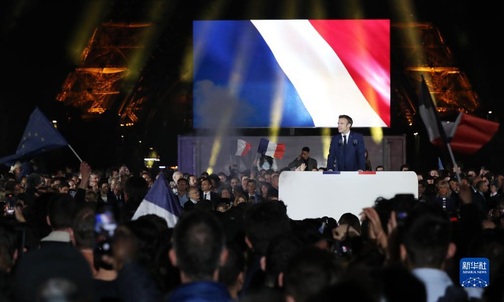 4月24日,法國現任總統馬克龍在巴黎出席選舉后的慶祝集會。新華社記者 高靜 攝