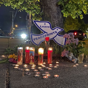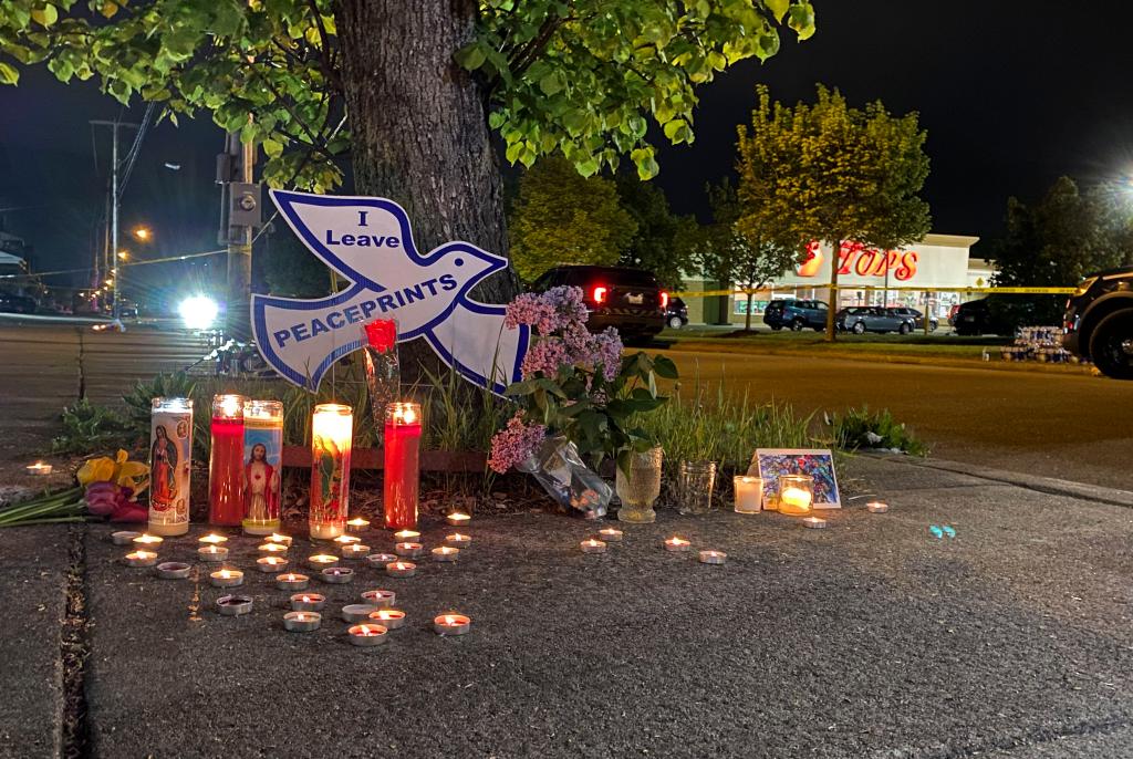 5月15日凌晨,人們在美國紐約州布法羅市的槍擊案現場附近擺放蠟燭紀念遇難者。新華社發(張杰攝)