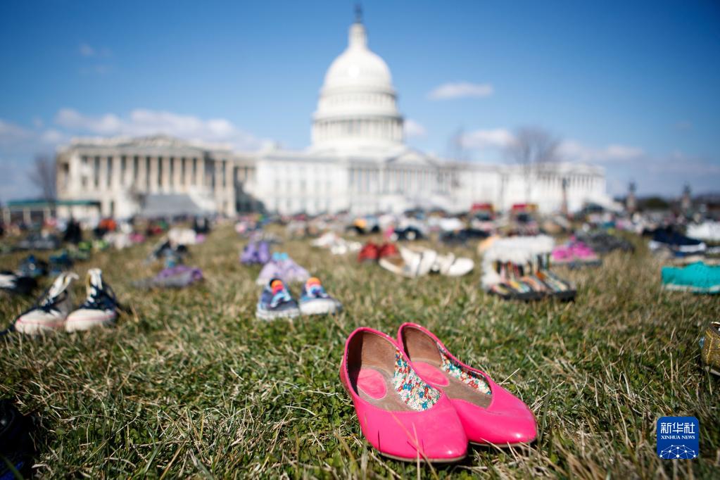2018年3月13日,7000雙代表自2012年美國(guó)康涅狄格州桑迪胡克小學(xué)槍擊案以來(lái)槍擊事件中遇難兒童的鞋子擺放在華盛頓國(guó)會(huì)山前的草坪上。人們以這種無(wú)聲的方式,抗議國(guó)會(huì)面對(duì)槍擊頻發(fā)現(xiàn)狀的不作為,呼吁槍支改革以保障兒童安全。新華社發(fā)(沈霆攝)