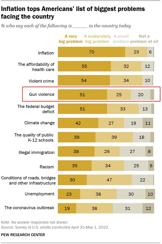 皮尤研究中心2022年4月進(jìn)行的調(diào)查顯示,有76%的美國(guó)人認(rèn)為槍支暴力已成為美國(guó)面臨的“很?chē)?yán)重或比較嚴(yán)重的問(wèn)題”。圖片來(lái)源:皮尤研究中心網(wǎng)站截圖