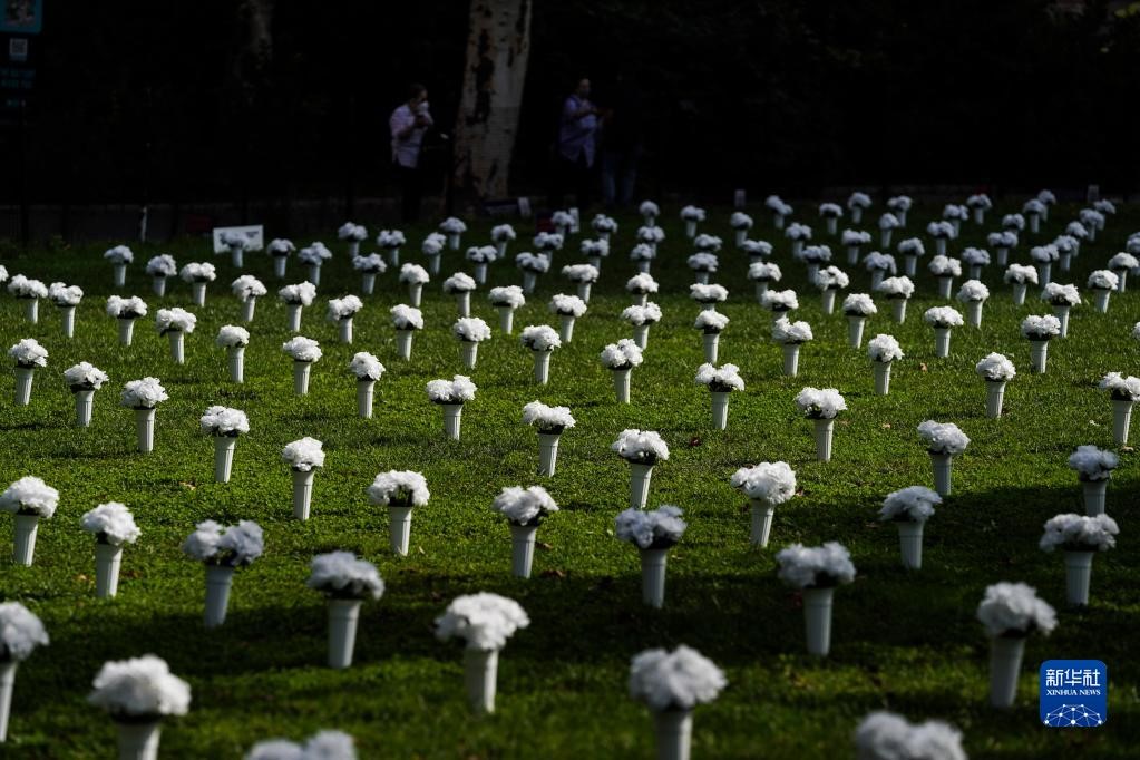 這是2021年10月8日在美國(guó)紐約炮臺(tái)公園內(nèi)拍攝的為悼念槍支暴力遇難者擺放的白色瓶花。據(jù)主辦方介紹,這個(gè)由1050個(gè)白色瓶花組成的大型紀(jì)念裝置旨在悼念2020年在紐約州死于槍支暴力的1050名受害者,呼吁政府針對(duì)槍支暴力采取行動(dòng)。新華社記者 王迎 攝
