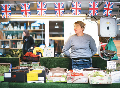 英國通脹率近來屢創(chuàng)新高,面對物價飛漲、生活成本增加,更多英國人會在購物時貨比三家。圖為五月三十日,在英國倫敦,一名蔬果攤主在市場等待顧客。