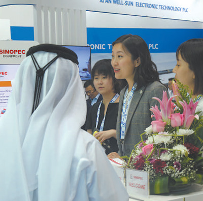 在阿聯酋阿布扎比國際石油展上,中方工作人員向外國客商介紹易派客平臺。