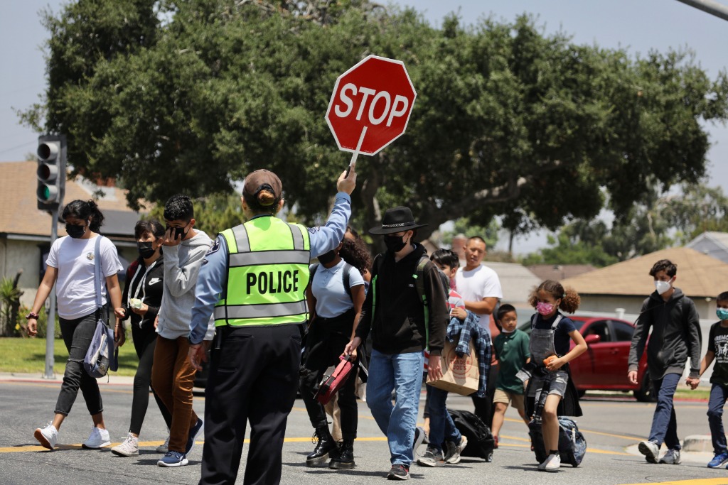 5月25日,一名警員在美國洛杉磯縣一所小學附近臨時指揮交通,為學生放學提供安全保護。新華社發(fā)