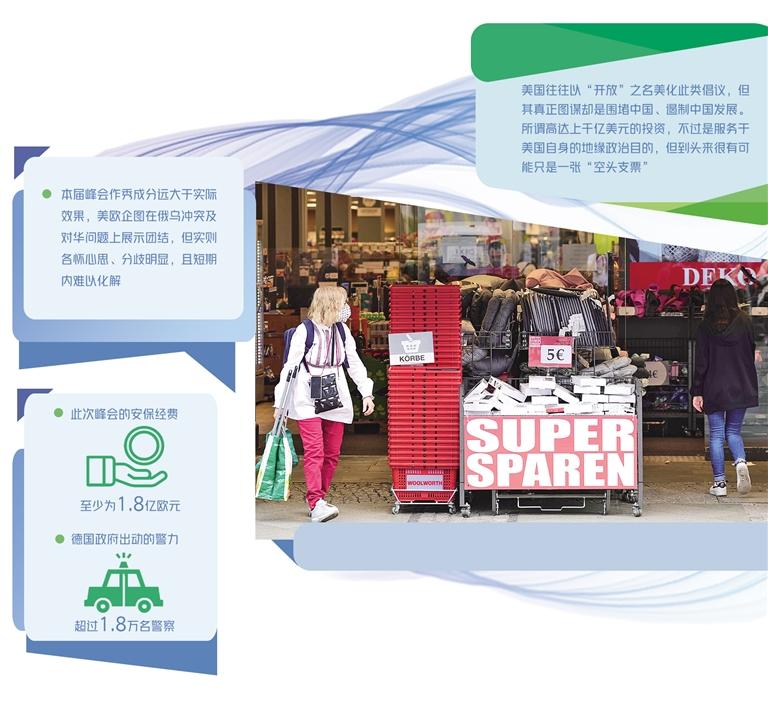 對此,德國媒體分析稱,僅僅為展示西方世界的團結就舉辦耗費巨大的峰會,透露出“一場空洞的作秀”的信號。為了峰會召開的短短48小時,各國領導人帶領龐大的團隊專程飛赴德國參會,并居住在奢華的埃爾茂城堡酒店,動用的人力和物力規模巨大。據統計,此次峰會的安保經費至少為1.8億歐元,而德國政府出動的警察超過1.8萬名。有分析指出,七國集團已不符合時代要求、亟需改變,此次峰會是西方政界變得與現實脫節的一個明顯例證。