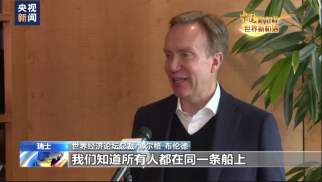 世界經濟論壇總裁 博爾格·布倫德:我們知道所有人都在同一條船上,必須一起解決共同面臨的問題。2017年習近平主席在達沃斯發表演講,強調了中國對國際合作的堅定承諾和對多邊主義的信心,這令人鼓舞。現在我們面臨的挑戰是全球性的,我們需要的也是全球性的合作。