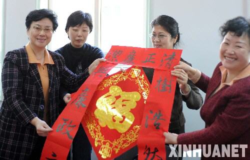 1月28日,天津市紅橋區紀檢委書記李紅梅(左)向干部家屬贈送春聯。 春節前夕,天津市紅橋區舉辦迎新春家庭送“廉”活動,在全區黨員干部中積極開展“樹廉潔家風、創文明家庭”為主題的家庭助廉教育,倡議黨員干部在春節期間廉潔自律,自覺抵制腐敗現象。 新華社記者王曄彪攝