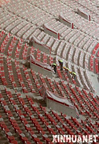 2月17日,工人們在國家體育場內(nèi)清潔座椅。北京2008年奧運會主會場――國家體育場(“鳥巢”)8萬個固定座椅于1月底安裝完工,這意味著國家體育場建設(shè)工程已接近尾聲。 新華社記者邢廣利攝