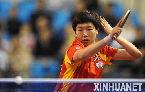 5月3日,李曉霞在女子組單打比賽中以3比0戰勝范瑛。當日,中國乒乓球超級明星熱身賽在山西省太原市濱河體育中心舉行,這是中國乒乓球隊備戰北京奧運會而進行的“以賽代練”。 新華社記者江宏景攝