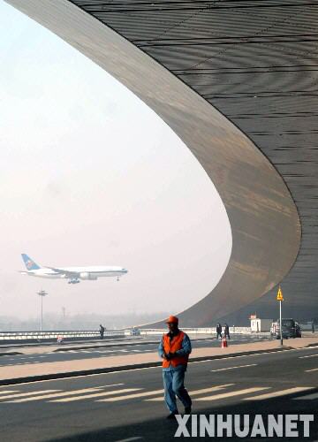 一架飛機從即將開航運營的3號航站樓旁掠過(2月19日攝)。 新華社記者羅曉光攝