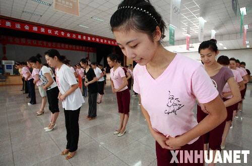7月23日,奧運禮儀小姐們在進行頒獎禮儀動作訓練。 新華社記者魏培全攝