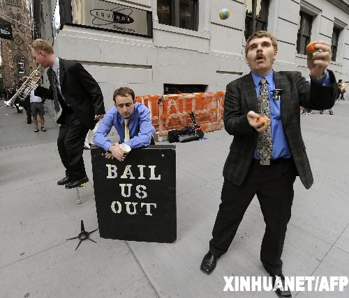 2008年10月14日 失業(yè)人員華爾街街頭賣藝 10月13日,在美國(guó)紐約的華爾街,幾名失業(yè)的金融業(yè)從業(yè)人員在街頭賣藝掙錢。 新華社/法新