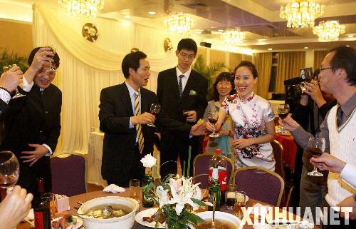 上海一對新人在婚宴上向來賓敬酒(11月1日攝)。 據國家統計局上海調查總隊最新數據顯示,2008年前三個季度,上海市城市居民家庭人均可支配收入突破2萬元,達20257元,居全國首位,同比增長13.6%,其中,工資性收入是推動可支配收入增長的主要因素。 新華社記者 張明 攝