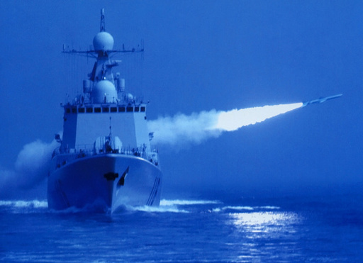 中國(guó)海軍導(dǎo)彈驅(qū)逐艦發(fā)射反艦導(dǎo)彈。