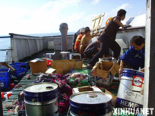 12月17日,在亞丁灣水域,“振華4”號(hào)船員在甲板上抵抗海盜襲擊。 新華社發(fā)