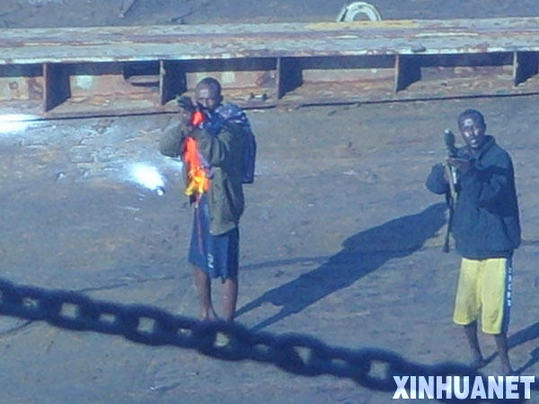 12月17日,在亞丁灣水域,海盜登上中國(guó)“振華4”號(hào)貨輪甲板。 新華社發(fā)