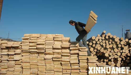 3月3日,一名工人在黑龍江省綏芬河市一個木材場工作。據綏芬河木材行業協會介紹,春節前后,從俄羅斯進口的木材僅有30車皮,到3月初木材進口量已經增長到每天200多車皮。位于中俄邊境的綏芬河市是中國主要的木材貿易集散地之一。新華社記者劉愷攝