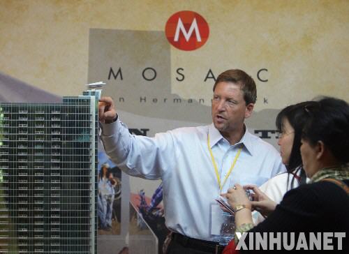4月12日,來自美國(guó)馬賽克公司的經(jīng)銷總經(jīng)理托馬斯(左)在向中國(guó)消費(fèi)者介紹他們的房子。 4月10日至12日,美中房地產(chǎn)展示交易會(huì)在北京召開,該交易會(huì)由美中貿(mào)易發(fā)展協(xié)會(huì)等單位組織,70多家美國(guó)開發(fā)商和中介機(jī)構(gòu)參加交易會(huì)。據(jù)主辦方預(yù)計(jì)在3天時(shí)間內(nèi),會(huì)有500多套住宅意向成交。新華社記者 邢廣利 攝