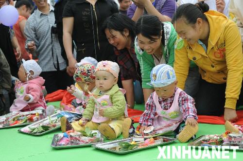 2009年5月13日 108個(gè)地震“羅漢娃”舉行生日抓周會(huì) 5月13日,地震“羅漢娃”正在抓周。 2008年5月12日,汶川大地震發(fā)生后,四川省什邡市婦幼保健院被震成危房,相鄰的千年古剎羅漢寺當(dāng)天收留了將要臨產(chǎn)的全部孕婦。羅漢寺內(nèi),禪床變產(chǎn)床,廚房成產(chǎn)房,從5月13日清晨到8月7日什邡市婦幼保健院板房區(qū)建好的兩個(gè)多月里,羅漢寺內(nèi)先后誕生了108個(gè)孩子,他們被人們親切地稱為“羅漢娃”。2009年5月13日,在什邡市剛剛落成的由北京援建的北京小學(xué)操場(chǎng)上,108個(gè)“羅漢娃”舉行了集體生日抓周活動(dòng)。許多愛(ài)心人士不遠(yuǎn)千里來(lái)到現(xiàn)場(chǎng),與寶寶們結(jié)對(duì),拜認(rèn)干爹干媽。