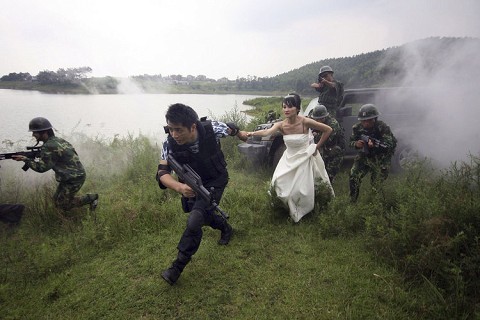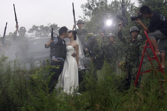 參加南京新婚夫妻陳河與馮潔今(音譯)婚禮的客人們感覺自己身處戰場。這對戀人在“戰火硝煙”中向對方許諾下終身。兩個新人在以前就一直就是軍事發燒友,他們就是在BB彈射擊運動場結識的。