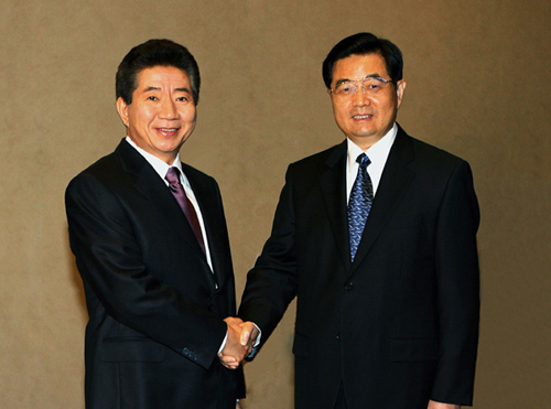 雙方就朝鮮半島局勢交換了意見。胡錦濤表示,在各方共同努力下,六方會談進程取得積極進展,各方對話達成不少共識,為下一階段工作打下了良好基礎。實現半島無核化任重道遠,各方還要繼續努力。中方愿繼續同包括韓方在內的各方一道,共同做好下一階段工作,全面均衡落實已經達成的協議,穩步推進六方會談進程,爭取早日實現半島無核化,維護半島和東北亞和平穩定。
