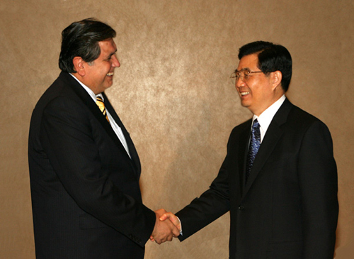 加西亞贊同胡錦濤對發展兩國關系的建議,他表示,秘魯以長遠眼光看待和發展同中國的關系。秘魯祝賀中國在經濟社會發展過程中所取得的巨大成就,中國發展對秘魯具有重要意義,秘魯希望同中國發展密切、穩固的友好關系,在港口、電力、礦產、旅游等領域加強和擴大合作。
