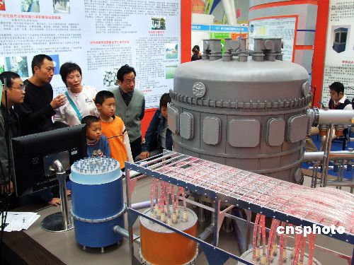 2006年10月29日,在第六屆中國合肥高新技術項目——資本對接會布展現(xiàn)場,我國自主研制的世界第一個非圓截面全超導托卡馬克核聚變裝置EAST(俗稱“人造太陽”)模型吸引了不少市民和客商的眼球。據(jù)了解,該模型按1∶8的比例制作,可以直觀地看到“人造太陽” 的放電過程。 中新社發(fā) 葛宜年 攝