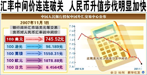 11月7日,中國外匯交易中心公布,人民幣對美元匯率中間價(jià)突破7.45關(guān)口,以7.4476再創(chuàng)匯改以來的新高,單日升值幅度達(dá)到101個(gè)基點(diǎn),這是今年以來人民幣匯率第68次創(chuàng)新高。按照匯改時(shí)8.11的匯率計(jì)算,匯改以來人民幣累計(jì)升值幅度已達(dá)到8.18%。