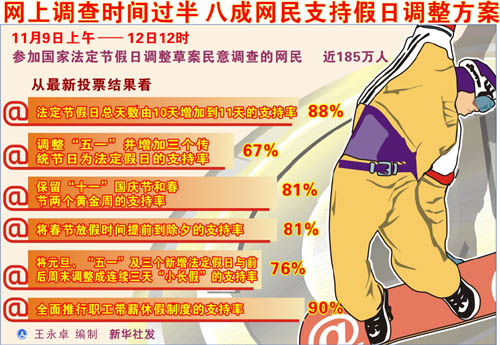 繼11月5日國務院發布《職工帶薪休假規定(征求意見稿)》之后,11月9日,國務院又發布了《法定節假日調整方案(征求意見稿)》,截至11月15日20時,除掉無效投票外,大約155萬網民參加了此項調查。政府密集出臺與職工休息權密切相關的政策、法規,而且立即引起全社會的廣泛參與和積極討論,折射出的是最近兩年職工休息權問題,已成為全社會關注的焦點。