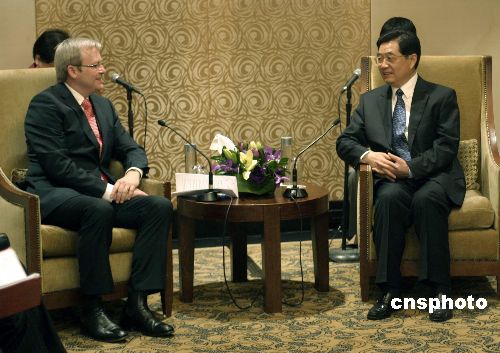 資料圖:2007年9月7日,中國國家主席胡錦濤在悉尼會見澳大利亞反對黨領袖陸克文。 中新社發 賴海隆 攝