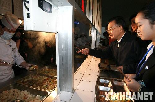 元旦來臨之際,中共中央政治局常委、國務院總理溫家寶來到陜西農村和企業看望、慰問廣大干部群眾,向大家致以新年的問候。這是12月29日,溫家寶在西飛集團的職工餐廳排隊打飯,和職工一起就餐。 新華社記者姚大偉攝