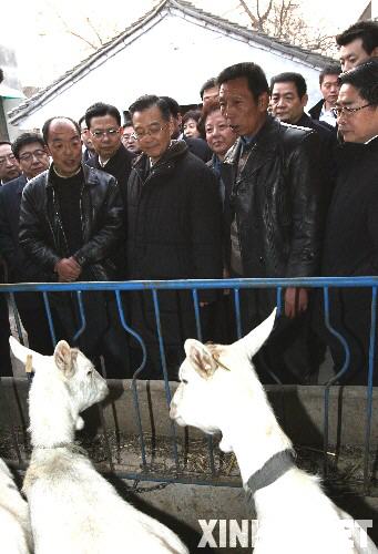 元旦來臨之際,中共中央政治局常委、國務院總理溫家寶來到陜西農村和企業看望、慰問廣大干部群眾,向大家致以新年的問候。這是12月29日,溫家寶在富平縣王寮鎮雙楊村看望奶山羊養殖戶。 新華社記者姚大偉攝
