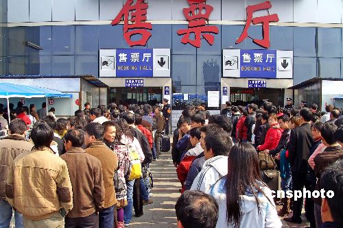 為確保廣大農(nóng)民工春節(jié)前平安順利返鄉(xiāng)和節(jié)后及時(shí)安全返城,二00八年春運(yùn)中國(guó)鐵路將首次辦理農(nóng)民工往返火車票。資料圖為2007年春運(yùn)時(shí),旅客在售票廳外排起長(zhǎng)龍。 中新社發(fā) 劉君鳳 攝