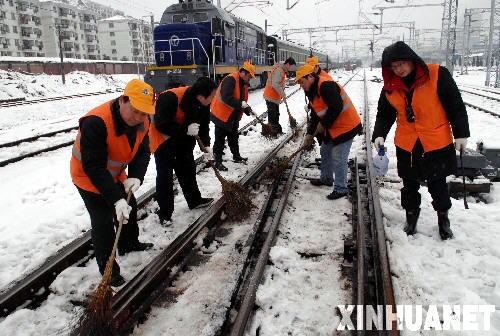 1月20日,合肥火車站工作人員在清除鐵道上的積雪,確保鐵路列車安全。 當日9時20分,合肥市氣象臺繼續發布暴雪黃色預警信號。連日來,合肥地區普降大雪,氣象部門連續發布暴雪警報。目前降雪仍在持續,給市民出行帶來不便。 新華社發